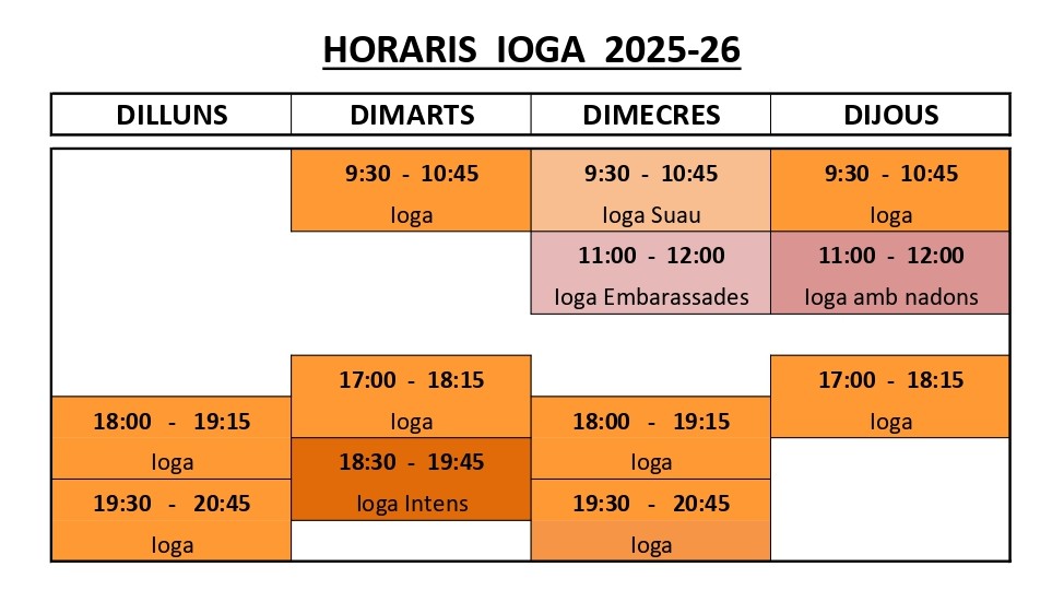 HORARI IOGA Propera sessió de IOGA NIDRA el divendres 13 de març a les 19h!!! Seguim amb la possibilitat de fer la classe de IOGA ON-LINE, en directe! INFORMA’T!! El taller de IOGA NIDRA, es realitza un cop al mes. INFORMA’T!!! torna enrere